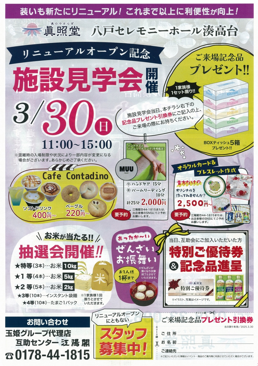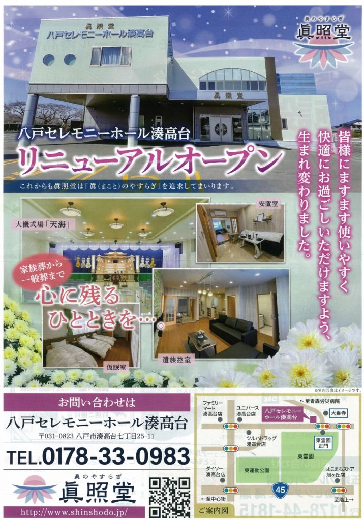 2025年03月26日 【施設見学会】八戸セレモニーホール湊高台 カテゴリー: お知らせイベント情報見学会情報 総合葬祭ホール「八戸セレモニーホール湊高台」は改修工事を行いました。 工事期間中は大変ご迷惑をお掛け致しました。 リニューアルオープン記念といたしまして 施設見学会と相談会を開催いたします。 どうぞお誘い合わせの上、お気軽にお越しください。 日時:3月30日(日) 時間:11:00~15:00 場所:八戸セレモニーホール湊高台 八戸市湊高台7丁目25-11 TEL:0178-33-0983 見学会のご予約・お問い合わせ 互助センター江陽閣 TEL:0178-44-1815