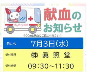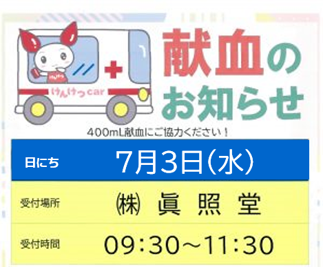 2024年07月02日 献血のお知らせ カテゴリー: お知らせ 献血のお知らせ 眞照堂八戸セレモニーホール城下に 献血バスがきます。 皆さまのご協力をよろしくお願いいたします。 【日時】7月3(火 )9:30~11:30 400ml献血にご協力をお願いします。 7月は“愛の献血助け合い運動”月間です