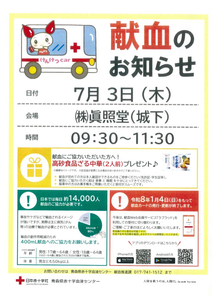 2025年06月18日 献血のご協力お願いします カテゴリー: お知らせ 献血のお知らせ 眞照堂八戸セレモニーホール城下にて 献血を行ないます。 皆さまのご協力よろしくお願いいたします。 【日時】7月3(木)9:30~11:30 400ml献血にご協力をお願いします。