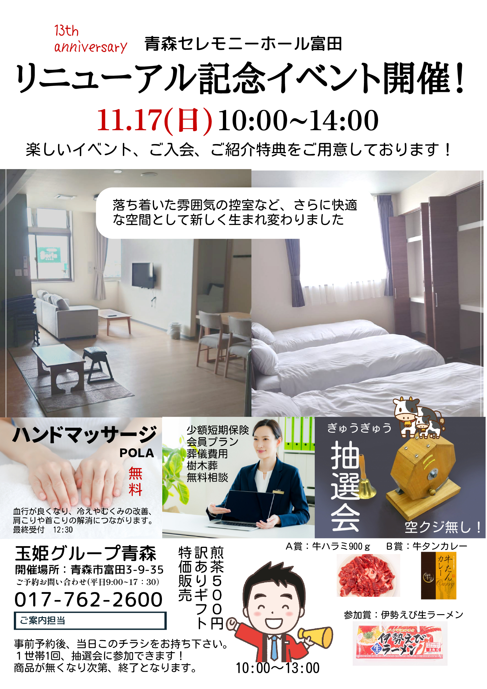 2024年11月08日 青森セレモニーホール富田 リニューアル記念 カテゴリー: お知らせイベント情報玉姫グループ青森見学会情報 総合葬祭ホール「青森セレモニーホール富田」は改修工事を行いました。 工事期間中は大変ご迷惑をお掛け致しました。 リニューアルオープン記念といたしまして 施設見学会と相談会を開催いたします。 どうぞお誘い合わせの上、お気軽にお越しください。 日時:11月17日(日) 時間:10:00~14:00 場所:青森セレモニーホール富田 青森市富田3丁目9-35 TEL:017-782-2200 見学会のご予約・お問い合わせ 玉姫グループ青森 青森営業部 TEL:017-762-2600